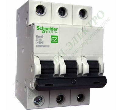 Автоматический выключатель серии Easy9 Schneider Electric, 3-полюсный, номинальный ток 50 А, характеристика С, Icn = 4.5 кА. - Применяется в трехфазных сетях напряжением до 400 В. - Предназначен для защиты от перегрузок и КЗ. - Оснащен механизмом «мгновенного включения». - Ударопрочный корпус из специального пластика с 6 металлическими заклепками. - Безопасные клеммы исключают попадание кабелей в заклеммное пространство. - Возможность опломбирования силовых клемм.